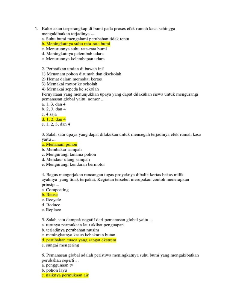 Soal pilihan ganda materi pemanasan global dan jawaban. Soal pemanasan global global warming pilihan ganda pembahasan merupakan materi ipa kelas 7 dan juga fisika kelas 11 sma yang wajib siswa . Contoh dampak sosial dari pemanasan global adalah perubahan mata pencaharian penduduk, terutama di daerah pertanian akibat perubahan iklim . Efek rumah kaca dan pemanasan global. Dalam soal ipa yang kami bagikan ini, ada beberapa materi pokok yang.